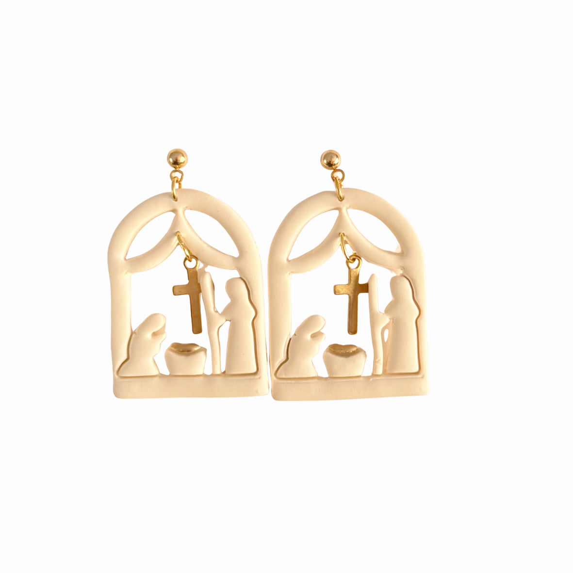 A beautiful reminder of the reason for the season — these handmade Nativity Scene earrings feature a delicate cutout of Mary, Joseph, and baby Jesus beneath an arched frame, accented with a hanging gold cross. The soft neutral tone keeps them elegant and timeless, making them the perfect holiday statement piece for any Christmas gathering or faith-filled celebration.