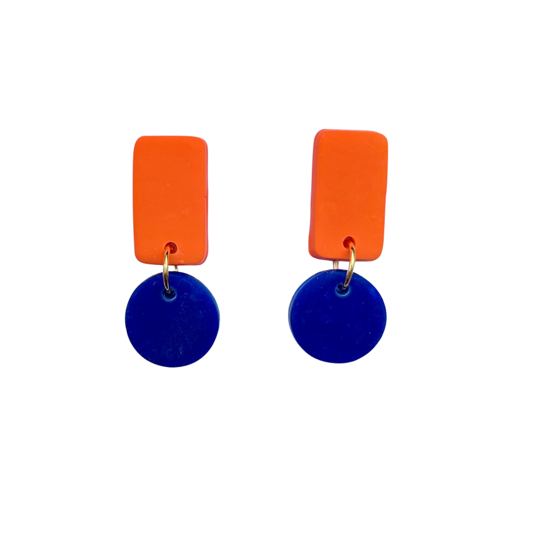 Bring the Florida spirit to life with these playful, handcrafted clay earrings in vibrant blue and orange. Featuring bold circles and layered shapes, these lightweight earrings are designed to make a statement. Perfect for game days, tailgates, or adding a touch of fun to your everyday style. Bright, bold, and bursting with Gator pride!